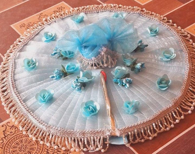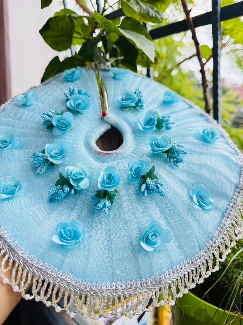 Made using a high-quality net base material, this poshak ensures durability while maintaining a lightweight and graceful appearance. The addition of exquisite flower and lace work lends it charm and sophistication, giving your Laddu Gopal idol a divine and regal look. The ensemble comes complete with a beautifully adorned Mukut (crown), amplifying the magnificence of your deity’s appearance.