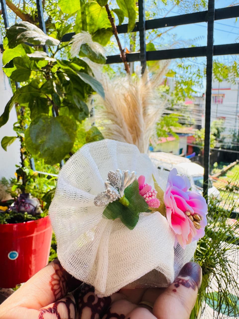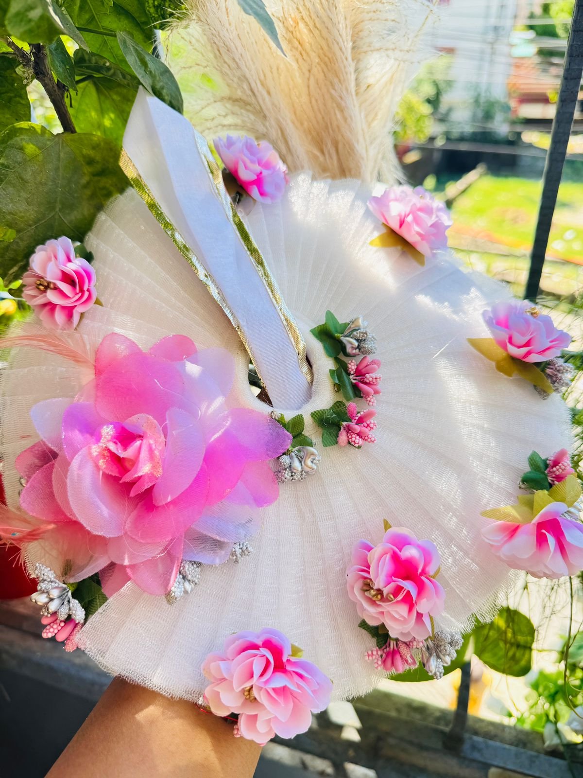 Made from high-quality net base material, this poshak embodies sophistication and grace. The translucent texture beautifully complements the fine pollen and flower work, creating an exquisite representation of artisanal craftsmanship. The rich detailing ensures that the attire stands out, making it an ideal decoration for your deity.